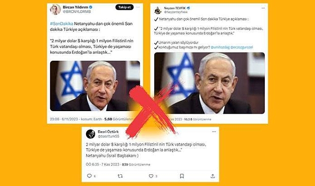 Dezenformasyonla Mücadele Merkezi'nin sosyal medya hesabından yapılan açıklamada, "Bazı sosyal medya hesaplarından paylaşılan, 'Netanyahu'dan açıklama: 2 milyar dolar karşılığında 1 milyon Filistinlinin Türk vatandaşı olması, Türkiye'de yaşaması konusunda Erdoğan ile anlaştık' iddiası doğru değildir. Cumhurbaşkanımız Sayın Recep Tayyip Erdoğan'ın bu yönde bir görüşmesi veya İsrail Başbakanı Binyamin Netanyahu'nun böyle bir açıklaması söz konusu değildir. İddialar tamamen uydurmadır" denildi.