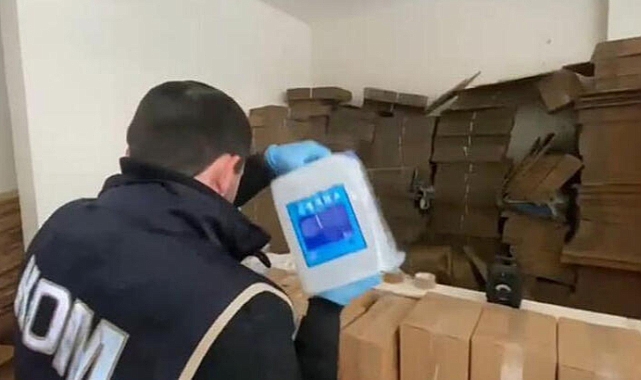 İzmir İl Emniyet Müdürlüğü Kaçakçılık Suçlarıyla Mücadele Şube Müdürlüğü ekipleri, Bayraklı'da bir depoda vatandaşların içki yapımında kullanmaları için 'el dezenfektanı' adı altında etil alkol üretip satıldığı bilgisi üzerine harekete geçti. Adrese düzenlenen operasyonda 1 ton sahte etil alkol ve 49 bin 500 adet etiket ele geçirildi. 2 şüpheli hakkında adli işlem başlatıldı.