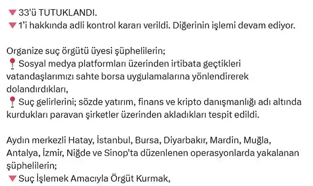 Bakan Ali Yerlikaya'nın sosyal medya hesabından yaptığı açıklamaya göre; Nazilli Cumhuriyet Başsavcılığı koordinesinde; Hatay, İstanbul, Bursa, Diyarbakır, Mardin, Muğla, Antalya, İzmir, Niğde ve Sinop'ta düzenlenen eş zamanlı operasyonlarda dolandırıcılık, kara para aklama ve suç örgütü kurma suçlamalarıyla şüpheliler hakkında soruşturma başlatıldı. Şüphelilerin sosyal medya platformlarından irtibat kurdukları vatandaşları sahte borsa uygulamalarına yönlendirip dolandırdıkları, elde ettikleri suç gelirini ise yatırım, finans ve kripto danışmanlığı adı altında kurdukları paravan şirketler üzerinden akladıkları tespit edildi. Hesaplarında 2,5 milyar TL'lik işlem hacmi bulunan, elebaşılığını K.U. ve H.İ.K.'nin yaptığı organize suç örgütüne yönelik jandarma operasyonunda; 2 elebaşının da aralarında olduğu 35 şüpheliyi yakalandı. Şüphelilerden 33'ü tutuklanırken, 1 şüpheli hakkında adli kontrol kararı verildi, diğer şüphelinin ise işlemleri sürüyor.
