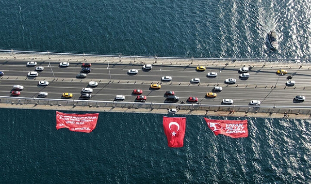 15 Temmuz Temmuz Demokrasi ve Milli Birlik Günü'nün 7'nci yıl dönümü nedeniyle 15 Temmuz Şehitler Köprüsünde'nde etkinlik düzenlendi.İstanbul Valiliği ile 15 Temmuz Derneği'nin birlikte gerçekleştirdiği etkinliğe İstanbul Vali Yardımcısı Özlem Bozkurt Gevrek, 15 Temmuz Derneği Başkanı İsmail Hakkı Turunç, Başkan Vekili Tarık Şebik, yönetim kurulu üyeleri, şehit yakınları, gaziler ve vatandaşlar katıldı.Hafıza 15 Temmuz Müzesi önünde bir araya gelen grup adına konuşan 15 Temmuz Derneği Başkanı İsmail Hakkı Turunç, "15 Temmuz hain darbe girişiminin 7'nci yılı münasebetiyle daha önceki yıllarda olduğu gibi köprüye, o gün asılan bayrağımızı temsilen, Cumhurbaşkanlığı İletişim Başkanlığı, İstanbul Valiliği ve 15 Temmuz Derneği olarak, şehit aileleri ve gazilerimizin katılımıyla bayrağımızı tekrar asacağız. Bayrağımızı hainler indirmesin diye hayatlarını seve seve feda eden şehitlerimizi hatırlayacağız. Zaten hiç unutmadık.Gazilerimizi hatırlayacağız. Burada asacağımız bayrak bu topraklarda binlerce yıl, toprağın her coğrafyasında olduğu gibi binlerce yıl göklerde dalgalanacak. Çünkü bu bayrak, özgürlüğümüzün ve bağımsızlığımızın sembolüdür.Şehitlerimiz de o mana ve ruhu bildikleri için hayatlarını seve seve ortaya koydular.Şehitlerimize ve yakınlarına söz veriyoruz; bayrak asla inmeyecek. Vatan bölünmeyecek ve bu millet asla esir olamayacak. Bağımsızlık ve özgürlüğünü sürdürerek örnek bir millet olarak yoluna devam edecek" dedi.Grup, konuşmanın ardından 15 Temmuz Şehitler Köprüsü'nün ortasına kadar yürüdü. Burada, üç noktadan Türk Bayrağı ve 15 Temmuz Derneği flaması köprüye asıldı.