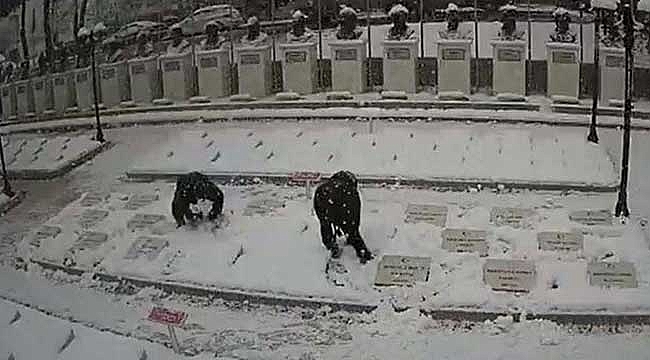 Çanakkale'de saat 15.00 sıralarında kar yağışı devam ederken, Çan Belediyesi Çanlı Gaziler, Şehitler ve Türk Devletleri Anıtı'na gelen 2 genç, karla kaplanan mezar taşlarını temizledi. O anlar ise belediyenin güvenlik kameralarına yansıdı.