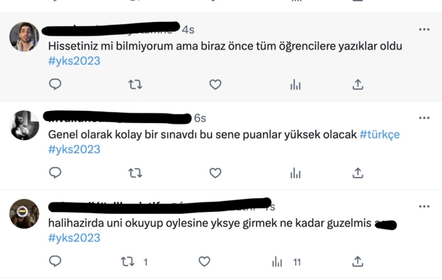 YKS sınav yorumları, Yükseköğretim Kurumları Sınavı ile gündeme geldi. 3 milyon 527 bin 466 öğrencinin başvuruda bulunduğu YKS; TYT, AYT ve YDT olmak üzere üç farklı oturumda gerçekleştirilecek. YKS ilk oturumu 17 Haziran Cumartesi saat 10:15'te başladı ve öğrencilere 120 soru için 165 dakika verildi. TYT sınavının saat 13:00'te bitmesinin ardından YKS soru yorumları paylaşılmaya başlandı. İşte YKS sınavı TYT, AYT ve YDT soruları nasıldı, zor muydu kolay mıydı? sorusunun yanıtına ilişkin atılan twitler... YKS sınav ve soru yorumları, Yükseköğretim Kurumları Sınavı ile birlikte araştırılmaya başlandı. Yükseköğretim Kurumları Sınavı YKS Ölçme, Seçme ve Yerleştirme Merkezi ÖSYM tarafından TYT, AYT ve YDT olmak üzere 3 farklı oturumda gerçekleştiriliyor. Üniversite sınavı ilk oturumu olan TYT 17 Haziran Cumartesi günü saat 10:15'te başladı ve saat 13:00'te sona erdi. YKS ikinci oturumu AYT ve YDT sınavları ise 18 Haziran Pazar günü uygulanacak. İyi bir üniversite hayaliyle YKS'ye giren adaylar sınavlarda ter dökecek. Adaylara TYT Türkçe testinde 40, temel matematik testinde 40, sosyal bilimler testinde 20, fen bilimleri testinde 20 ise toplam 120 soru yöneltildi. Üniversite sınavının ardından YKS sınavı ile TYT soru yorumları sınavın ardından sosyal medya hesapları üzerinden paylaşılmaya başlandı. İşte 2023 YKS sınav yorumları ile soruların zorluk ve kolaylık durumları...