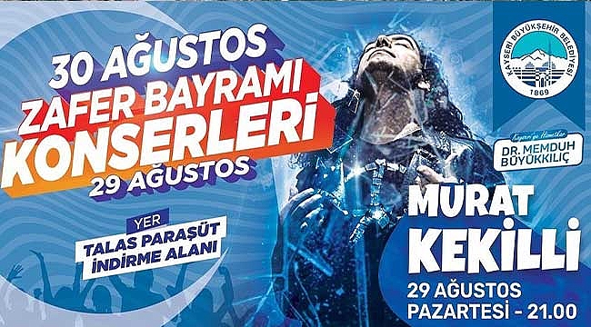 Kayseri Büyükşehir Belediyesi 30 Ağustos Zafer Bayramı kapsamında konserler düzenleyecek. 2 gün sürecek 30 Ağustos Zafer Bayramı Konserleri’nde ünlü ses sanatçıları Murat Kekilli, Ayşen Kaya ve Baha sahne alacak. 29 Ağustos Pazartesi saat 21.00’de Talas Paraşüt İndirme Alanı’nda sanatçı Murat Kekilli’nin sahne alacağı konserle başlayacak etkinliğin ikinci gününde, 30 Ağustos Salı saat 20.00’de sanatçı Ayşen Kaya ve yine aynı gün saat 21.00’de sanatçı Baha Kayserililerle buluşacak.