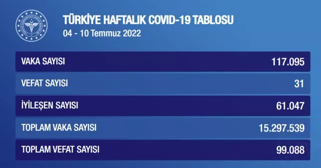 Sağlık Bakanlığı haftalık yeni tip koronavirüs (Kovid-19) verilerini açıkladı. Bakanlığın internet sitesinde yer verilen bilgilere göre, ülke genelinde 4 Temmuz - 10 Temmuz arasında 117 bin 95 kişinin koronavirüs testi pozitif çıktı, 31 kişi ise hayatını kaybetti. Öte yandan önceki haftaya göre vaka sayılarındaki artış dikkat çekti.