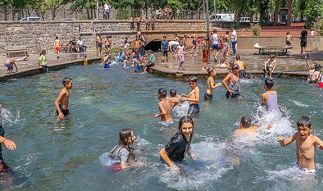 Siirt’te de mevsim normallerinin üzerinde seyreden hava sıcaklığı nedeniyle kent merkezinin en işlek meydan ve caddeleri boş kaldı.Algül Mahallesi’nde bulunan tarihi Babuddarp Camisi’nin avlusundaki küçük taş havuza giren yetişkinler ve çocuklar serinlemeye çalıştı.Serinlemek için havuza geldiğini belirten Sabahattin Evin, “Sıcaktan dolayı çocuklar gibi eğlenmeye geldik. Ayağımızı havuza soktuk, su buz gibi.Sıcaklarda çalışıyoruz, bizler de caminin kaynak suyunda biraz serinleyelim, dedik. İyi oldu bizim için” dedi.Öğle arasında işe ara verdiklerini ve Babuddarp Camisi’nin havuzunda serinlemeye çalıştıklarını söyleyen Necmettin Gündüz de “Havuz serin olduğu için buraya geldik.Bugün hava çok sıcak, buradaki soğuk suyla elimizi yüzümüzü yıkayarak serinlemeye çalıştık. Ondan sonra tekrar işimize devam edeceğiz” ifadelerini kullandı.