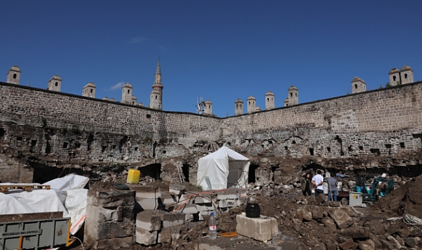 Melikgazi Belediyesi'nin Tarihi Kapalı Çarşı içerisinde bulunan Gön Han'da başlattığı restorasyon çalışmaları devam ediyor.
