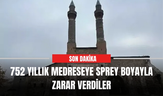 Sivas Cumhuriyet Meydanı'ndaki 752 yıllık Çifte Minareli Medrese'ye sprey boya ile yazı yazan 4 şüpheli, yakalandı. Şüpheliler hakkında, 'Kültür ve Tabiat Varlıklarını Koruma Kanunu'na muhalefet' suçundan işlem yapıldı.