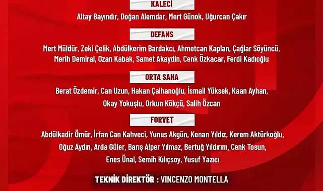Teknik direktör Vincenzo Montella’nın belirlediği kadroda şu isimler yer aldı;KALECİ: Altay Bayındır, Doğan Alemdar, Mert Günok, Uğurcan ÇakırDEFANS: Mert Müldür, Zeki Çelik, Abdülkerim Bardakcı, Ahmetcan Kaplan, Çağlar Söyüncü, Merih Demiral, Ozan Kabak, Samet Akaydin, Cenk Özkacar, Ferdi KadıoğluORTA SAHA: Berat Özdemir, Can Uzun, Hakan Çalhanoğlu, İsmail Yüksek, Kaan Ayhan, Okay Yokuşlu, Orkun Kökçü, Salih ÖzcanFORVET: Abdülkadir Ömür, İrfan Can Kahveci, Yunus Akgün, Kenan Yıldız, Kerem Aktürkoğlu, Oğuz Aydın, Arda Güler, Barış Alper Yılmaz, Bertuğ Yıldırım, Cenk Tosun, Enes Ünal, Semih Kılıçsoy, Yusuf YazıcıAY-YILDIZLILAR EURO 2024 ÖNCESİ İKİ HAZIRLIK MAÇI YAPACAKAy-yıldızlılar, EURO 2024 öncesi İtalya ve Polonya ile hazırlık maçlarında karşı karşıya gelecek. 4 Haziran'daki İtalya - Türkiye karşılaşması Serie A ekibi Bologna'nın maçlarına ev sahipliği yapan Renato Dall'Ara Stadyumu'nda oynanacak ve TSİ 22.00'de başlayacak. Polonya özel maçına kadar olan süreci, bu ülkenin Opalenica kasabasında kamp yaparak geçirecek Ay-Yıldızlılar, İtalya maçının ertesi akşamı Bolgona'dan Poznan'a hareket edecek. 9 Haziran'da ise Polonya - Türkiye maçının oynanacağı başkent Varşova'ya geçecek. 10 Haziran'daki Polonya - Türkiye karşılaşması ülkenin en yüksek kapasiteli futbol stadyumu olan PGE Narodowy'de oynanacak ve TSİ 21.45'te başlayacak. Ay-Yıldızlılar, 11 Haziran'da Polonya'dan Almanya'ya geçecek ve EURO 2024 hazırlıklarını merkez kamp yeri olarak kullanacağı Barsinghausen kasabasındaki tesiste sürdürecek.