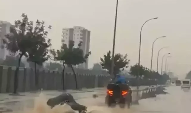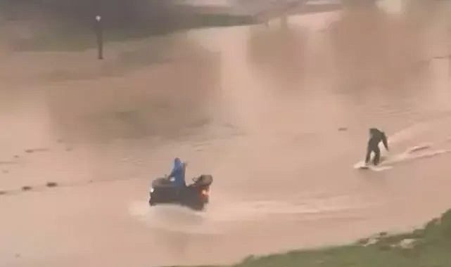 Adana'da etkili olan sağanağın ardından suyla dolan caddede bir vatandaşın sörf yaptığı anlar, cep telefonu kamerasıyla kayda alındı.