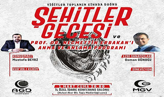 Anadolu Gençlik Derneği Kayseri Şube Başkanı Yusuf Şahin, etkinlikle ilgili yaptığı açıklamada, "Bu önemli gecede bir araya gelerek şehitlerimizi ve Necmettin Erbakan'ı anmak, onların hatıralarını yaşatmak, bizim için son derece kıymetlidir. Filistin’de zulüm sürerken Şeyh Ahmet Yasin’i anarak İslam şuurunu hatırlayacak, Avrupa’da ırkçılık artarken Aliya İzzetbegoviç’in önemini vurgulayacağız. Her biri bayrak taşıyan öncüleri, geçmişten geleceğe ışık olanları bu programda anlatmaya gayret edeceğiz. Tüm Kayseri halkını bu anlamlı etkinliğimize davet ediyoruz. " dedi.