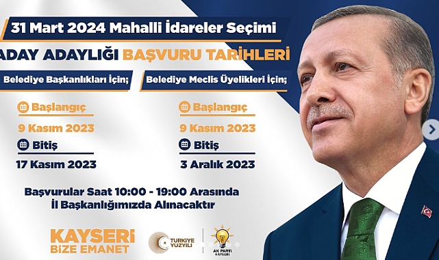 AK Parti Kayseri İl Başkanı Fatih Üzüm sosyal medya hesabından paylaştığı mesaj ile Belediye Başkanlığı ve Belediye Meclisi Üyeliği aday adaylığı başvuru süreci başladığını duyurdu. İl Başkanı Fatih Üzüm yaptığı açıklamda:" Genel Merkezimizin yönlendirmesi doğrultusunda, Belediye Başkanlığı ve Belediye Meclisi Üyeliği aday adaylığı başvuru sürecimiz resmi olarak 9 Kasım Perşembe yani bugün itibariyle başlamış bulunmaktadır.