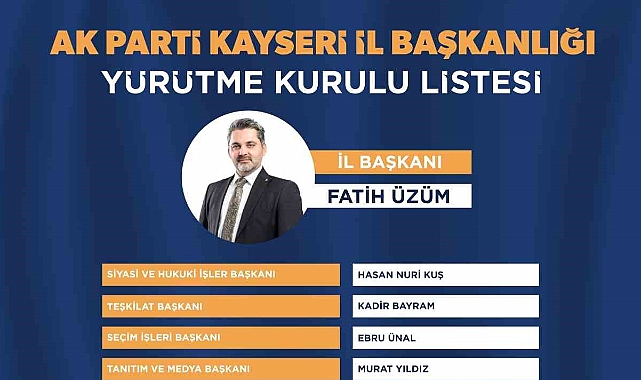 AK Parti İl Başkanı Fatih Üzüm AK Parti Kayseri Teşkilatı’nda yürütme kurulunda yer alan isimler açıkladı. AK Parti İl Başkanlığı tarafından Yürütme Kurulu’nda görev yapacak isimler belli oldu. Açıklamaya göre yürütme kurulu aşağıdaki listede yer almaktadır.