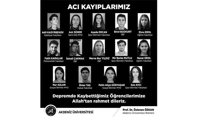 Kahramanmaraş'ta 7.7 ve 7.6 büyüklüğündeki 10 ili etkileyen depremler nedeniyle şu ana kadar 31 binden fazla kişi hayatını kaybetti, yaralı sayısı da 90 bine ulaştı. Akdeniz Üniversitesi Rektörü Prof. Dr. Özlenen Özkan, 14 öğrencisinin deprem bölgesinde hayatını kaybettiğini açıkladı. Sosyal medya hesaplarından, öğrencilerinin siyah beyaz fotoğraflarından oluşan paylaşım yapan Prof. Dr. Özkan, "Depremde kaybettiğimiz öğrencilerimize Allah'tan rahmet dileriz" dedi. HATAY'DAKİ 8 ÖĞRENCİEdebiyat Fakültesi öğrencisi Adil Kadyrbekov, Eğitim Fakültesi öğrencileri Nazar ve Ebru Erol kardeşler, Serik GSS Meslek Yüksek Okulu öğrencisi Aslı Sümer, Sosyal Bilimler Meslek Yüksek Okulu öğrencileri Pelin Aliye Günyaşar ve Nur Aslan, İktisadi ve İdari Bilimler Fakültesi öğrencisi Merve Nur Yıldız ve Spor Bilimleri Fakültesi öğrencisi Ayeda Ercan, Hatay'da hayatlarını kaybetti.ADIYAMAN'DA 3 ÖĞRENCİMühendislik Fakültesi öğrencisi Fatih Karalar, Hukuk Fakültesi öğrencisi Ömer Taş ve Spor Bilimleri Fakültesi öğrencisi Mir Berke Mutlu, Adıyaman'da yaşamını yitirdi. İktisadi ve İdari Bilimler Fakültesi öğrencisi İsmail Çakmak Gaziantep'te, yine aynı fakültenin öğrencisi Birol Bozkurt Kahramanmaraş'ta ve Spor Bilimleri Fakültesi öğrencisi Sıla Avcı ise Osmaniye'de yaşamını yitirdi.DEPREM BÖLGESİNE YARDIM ELİAyrıca 'asrın felaketi' olarak adlandırılan depremde teyakkuza geçen Akdeniz Üniversitesi, ilk andan itibaren deprem bölgesinde yardım çalışması yürütüyor. Deprem bölgesinde yaşayan öğrencilerin durumlarını öğrenmek için Acil Çağrı Merkezi, Deprem İhbar Formu ve Antalya Ulaşım Talep Formu oluşturuldu. Bölge halkı içinse yardım kampanyası başlatan AÜ, ilk günden itibaren AFAD koordinasyonunda deprem bölgesi ile iletişime geçti. AÜ Sağlık, Kültür ve Spor Dairesi Başkanlığı bünyesinde toplanan yardımlar, 3 TIR'la deprem bölgesine ulaştırıldı. Akdeniz Üniversitesi'nden 68 kişilik bir ekip de bölgede yaşayan 250'den fazla öğrencinin ailesine ulaştı. 10 ilde yardımlar yapılırken, 300'den fazla kişi başka kentlere transfer edildi.