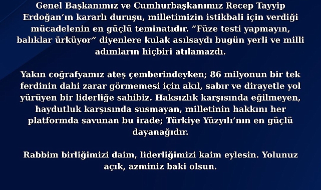 Genel Başkanımız ve Cumhurbaşkanımız Recep Tayyip Erdoğan’ın kararlı duruşu, milletimizin istikbali için verdiği mücadelenin en güçlü teminatıdır. “Füze testi yapmayın, balıklar ürküyor” diyenlere kulak asılsaydı bugün yerli ve milli adımların hiçbiri atılamazdı.Yakın coğrafyamız ateş çemberindeyken; 86 milyonun bir tek ferdinin dahi zarar görmemesi için akıl, sabır ve dirayetle yol yürüyen bir liderliğe sahibiz. Haksızlık karşısında eğilmeyen, haydutluk karşısında susmayan, milletinin hakkını her platformda savunan bu irade; Türkiye Yüzyılı’nın en güçlü dayanağıdır.Rabbim birliğimizi daim, liderliğimizi kaim eylesin. Yolunuz açık, azminiz baki olsun.Hüseyin OKANDAN AK Parti İl Başkanı
