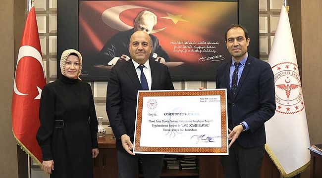 Kayseri İl Sağlık Müdürü Dr. Mehmet Erşan’ın teslim ettiği sertifikaları, Kayseri Devlet Hastanesi adına Hastane Başhekimi Doç. Dr. İsmail Altıntıop ve Sağlık Bakım Hizmetleri Müdürü Derya Ayaydın, Develi Dr. Ekrem Karakaya Devlet Hastanesi adına Başhekim Uzm. Dr. Ahmet Topbaş ve Sağlık Bakım Hizmetleri Müdürü Meral Özkara, Yahyalı Devlet Hastanesi adına Uzm. Dr. Muhammed Mustafa Özdemir teslim aldılar.