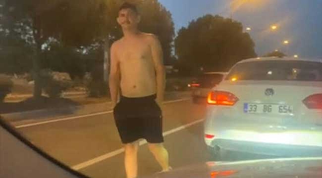 Mersin'de tatil bölgelerinden dönen vatandaşları taciz edip, araçlarına zarar veren trafik magandası, cep telefonuyla görüntülendi.