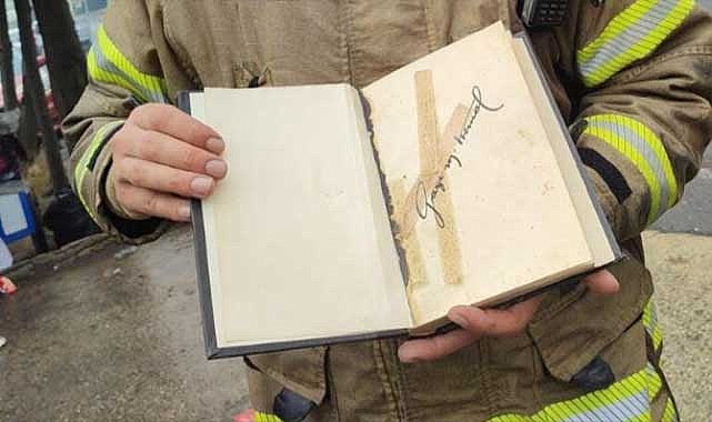 Başakşehir İkitelli Organize Sanayi Bölgesi'nde 4 gün boyunca yanan 6 katlı binada lojistik depolama yeri işleten Yakup Sermet Tezcan'ın (53) babaannesi Melek Per Çobanyıldızı Tezcan'ın İzmir'de Atatürk'e imzalattığı öne sürülen kitap, itfaiye erleri tarafından alevler içinden kurtarıldı.