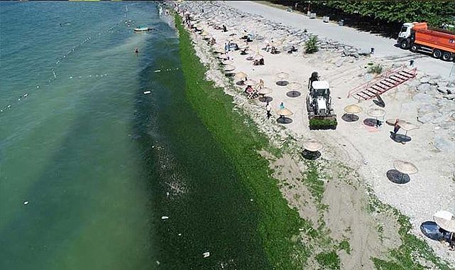 Avcılar'da lodosla metrelerce uzunluğundaki sahili yosun kapladı.