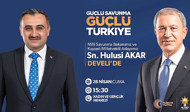 Bakan Akar, yarın Develi'ye geliyorMilli Savunma Bakanı ve AK Parti 1'nci sıra milletvekili adayı Hulusi Akar, yarın saat 15:30 Develi'de vatandaşlara hitap edecek. Sosyal medya hesabından tüm Develili vatandaşları programa davet eden Develi Belediye Başkanı Mehmet Cabbar:" Milli Savunma Bakanı Kayseri milletvekili adayı Sayın Hulusi Akar, Develili halkımıza hitap edecektir.Bütün Develi halkımız davetlidir" dedi.