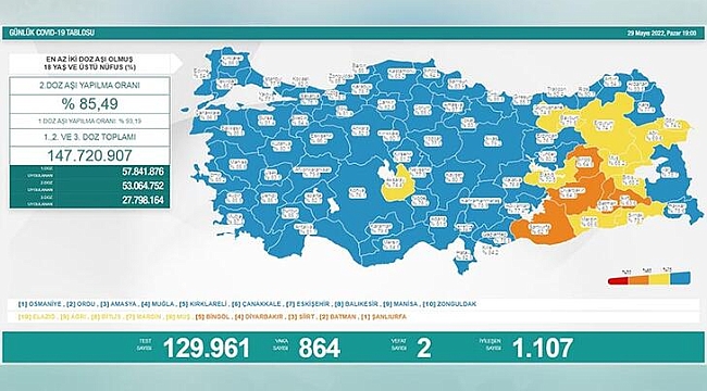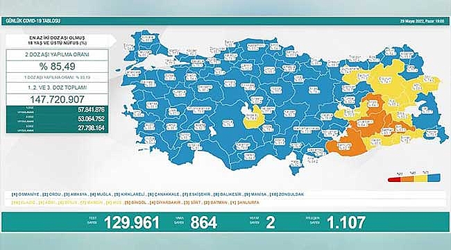 Sağlık Bakanlığı'nın açıkladığı 'Günlük Covid-19 Tablosu' verilerine göre; son 24 saatte yapılan 129 bin 961 testte 864 vaka tespit edildi. 2 kişi hayatını kaybederken, 1107 kişinin de tedavisi ve karantinası sona erdi. 18 yaş ve üzeri nüfusun aşılanması verilerinde 1'inci doz Türkiye ortalaması yüzde 93,19, 2'nci doz ortalaması yüzde 85,49 olarak belirlendi. Ayrıca 1'inci dozda 57 milyon 841 bin 876, 2'nci dozda 53 milyon 64 bin 752 ve 3'üncü dozda 27 milyon 798 bin 164 olmak üzere 147 milyon 720 bin 907 aşı uygulandı.En az 2 doz aşı olan kişi sayısı en yüksek iller; Osmaniye, Ordu, Amasya, Muğla, Kırklareli, Çanakkale, Eskişehir, Balıkesir, Manisa ve Zonguldak olurken, 2 doz aşı yapılan kişi sayısı en düşük iller ise Şanlıurfa, Batman, Siirt, Diyarbakır, Bingöl, Muş, Mardin, Bitlis, Ağrı ve Elazığ oldu.