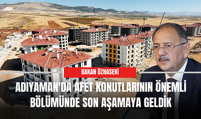 Çevre, Şehircilik ve İklim Değişikliği Bakanı Mehmet Özhaseki, "Adıyaman'da 41 bin 171 afet konutu, 23 bin 640 köy evi, 17 bin 392 depo-ahır ve iş yeri olmak üzere toplam 82 bin 203 bağımsız bölüm yapıyoruz. 41 bin 292 afet konutu ve köy evinin önemli bir bölümünde son aşamaya geldik" dedi.