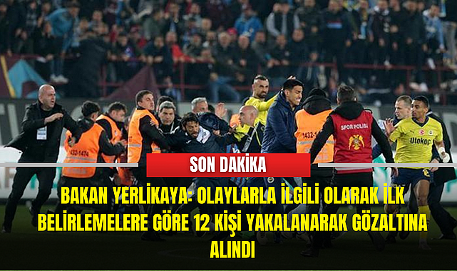 İçişleri Bakanı Ali Yerlikaya, Süper Lig'in 30'uncu haftasında dün akşam oynanan Trabzonspor - Fenerbahçe karşılaşması sonrası meydana gelen olaylarla ilgili olarak ilk belirlemelere göre 12 kişinin yakalanarak gözaltına alındığını açıkladı.