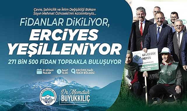 Çevre, Şehircilik ve İklim Değişikliği Bakanlığı ile Kayseri Büyükşehir Belediyesi ve Talas Belediyesi iş birliğinde Pazar günü gerçekleşecek Erciyes Dağı Tekir Yaylası ve Çevresi Karbon Yutak Alan Ağaçlandırması Töreni’nde 271 bin 500 fidan toprakla buluşacak. Pazar günü gerçekleşecek törene, Çevre, Şehircilik ve İklim Değişikliği Bakanı Mehmet Özhaseki de katılacak.