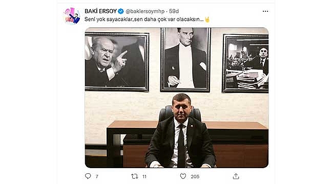Öncesinde sosyal medyayı çok aktif kullanan Bağımsız Kayseri Milletvekili Baki Ersoy, istifası sonrası uzun zamandır mesaj içerikli paylaşım yapmıyordu. Ersoy’un son yaptığı paylaşım ise ‘birilerine mesaj mı veriyor’ yorumlarına sebep oldu. Twitter hesabından; Atatürk, MHP Kurucu Genel Başkanı Alparslan Türkeş ve MHP Genel Başkanı Devlet Bahçeli’nin fotoğraflarının da yer aldığı kendi fotoğrafını paylaşan Ersoy, “Seni yok sayacaklar, sen daha çok var olacaksın” mesajını verdi. Ersoy’un bu paylaşımına takipçileri olumlu karşılık verdi. Yazılan birçok yorumda, Ersoy’a destek ifadeleri yer aldı.