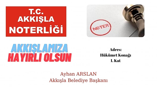 Akkışla Noterliği açıldı. Başkan Ayhan Arslan, “Hayırlı Olsun Akkışla'm mesajı ile duyurdu. Akkışla ilçesine açılan Noter vatandaşlar tarafından ilgiyle karşılandı. Sosyal medya hesabından müjdeyi veren Belediye Başkanı Ayhan Arslan:” İlçemize hizmetlerimiz devam ediyor. Bugun de vatandaşlarımıza müjdemizi vermek istiyorum. Vatandaşlarımız artık şehir merkezine gitmek zorunda kalmayacak. Hükümet Konağı’nın 1 katına açılan Akkışla Noterliği ile artık şehir merkezlerine gerek kalmayacak. “ dedi.