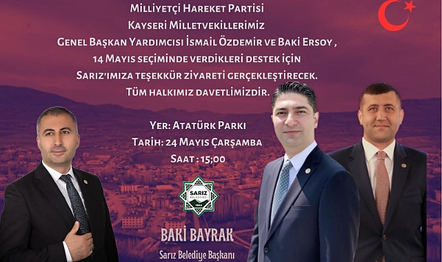 MHP İl Başkanı Ahmet Bağçovan ile birlikte Genel Başkan Yardımcısı Kayseri Milletvekili İsmail Özdemir ve Kayseri Milletvekili Baki Ersoy 24 Mayıs Çarşamba günü Saat 15: 00’da Sarız ilçesine vir ziyaret gerçekleştirecek.