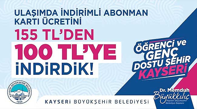 Kayseri Büyükşehir Belediye Başkanı Dr. Memduh Büyükkılıç, öğrencilerin toplu ulaşım araçlarında kullandığı aylık abonman kart ücretinde indirime gittiklerini belirterek, indirimli aylık abonman kartı ücretinin 155 TL’den 100 TL’ye indirildiği uygulamanın başladığını söyledi.