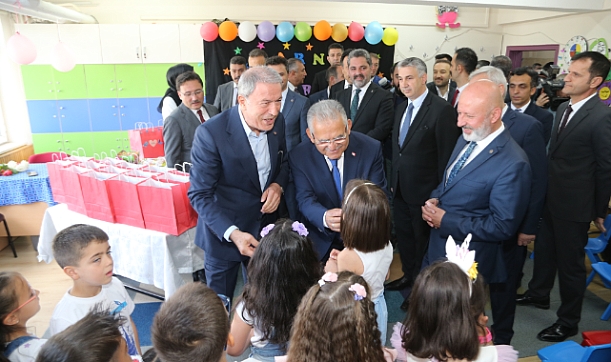 Başkan Büyükkılıç, Vali Çiçek ve TBMM Milli Savunma Komisyonu Başkanı Hulusi Akar, okul girişinde minikler tarafından çiçeklerle karşılandılar.