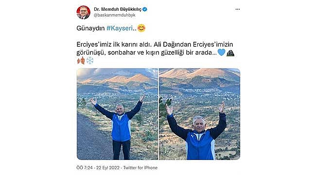 Kayseri Büyükşehir Belediye Başkanı Dr. Memduh Büyükkılıç, sabahın ilk ışıklarında Ali Dağı’nda yaptığı yürüyüş esnasında Erciyes’e yağan mevsimin ilk karını, “Erciyes’imiz ilk karını aldı” notuyla paylaştı.