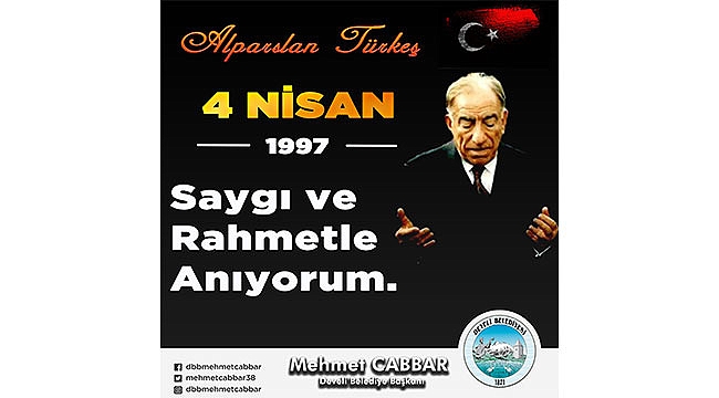 Develi Belediye Başkanı Mehmet Cabbar, Milliyetçi Hareket Partisi Kurucu Genel Başkanı merhum Alparslan Türkeş’i, vefatının 25. sene-i devriyesinde rahmet ile andı. Sosyal medya hesabından yaptığı payalşaımda;" Milliyetçi Hareket Partisi Kurucu Genel Başkanı merhum Alparslan Türkeş’i, vefatının 25. sene-i devriyesinde rahmet ve hayırla yâd ediyorum. Ruhu şâd, mekânı cennet olsun. " dedi.