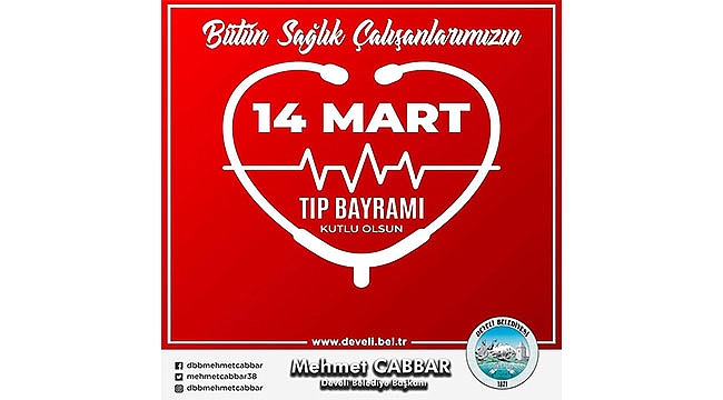 Develi Belediye Başkanı Mehmet Cabbar, 14 Mart Tıp Bayramı dolayısıyla bir mesaj paylaştı.Başkan Cabbar mesajnda:” İnsanın sağlıklı bir ömür sürmesi gibi yüce bir misyonu icra eden; özellikle de Covid 19 salgını sürecinde fedakarca hizmet veren tüm sağlık çalışanlarımıza 14 Mart Tıp Bayramı vesilesiyle bir kez daha teşekkür ediyor, çalışmalarında başarılar diliyorum.” ifadelerini kullandı.