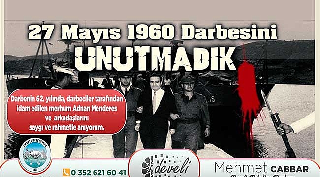 Develi Belediye Başkanı Mehmet Cabbar, 27 Mayıs 1960 darbesiyle ilgili bir mesaj yayımladı. Başkan Cabbar yayımlamış olduğu mesajında:" Darbenin 62. yılında darbeciler tarafından idam edilen merhum Adnan Menderes ve arkadaşlarını saygı ve rahmetle anıyorum." ifadelerini kullandı.
