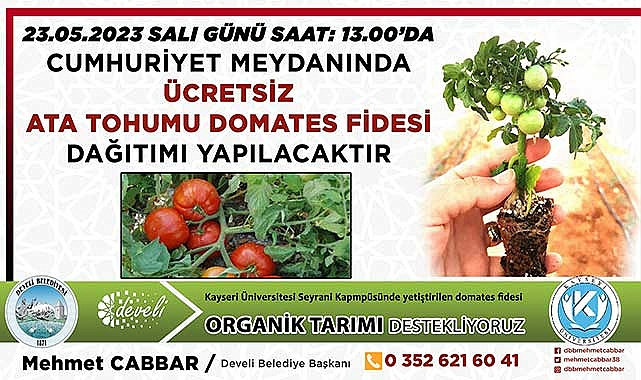 Develi Belediyesinin sosyal medya hesabından yapılan paylaşımda, “Organik tarımı desteklemek ve daha sağlıklı bir gelecek için belediyemiz, Seyrani Kampüsü içerisinde yetiştirilen ata tohumu domates fidelerini ilçemiz Cumhuriyet Meydanında halkımıza ücretsiz olarak dağıtacaktır. Tüm hemşerilerimiz davetlidir” denildi.