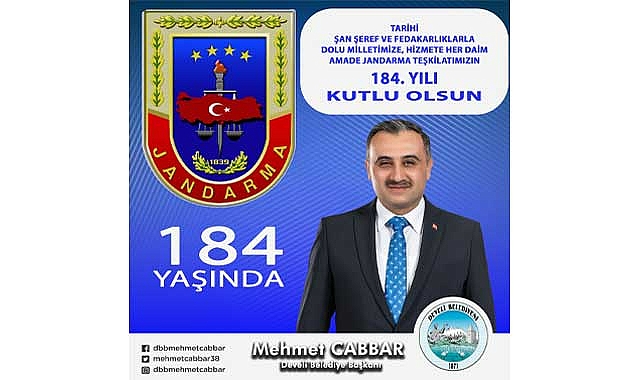 Develi Belediye Başkanı Mehmet Cabbar, Jandarma Teşkilatının 184. Kuruluş yıldönümü nedeniyle bir kutlama mesajı yayımladı.