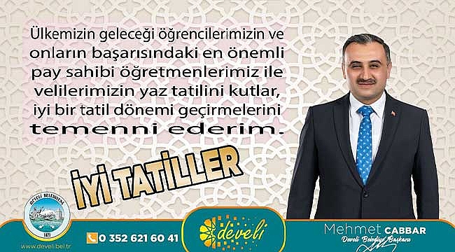 Develi Belediye Başkanı Mehmet Cabbar, yapmış olduğu paylaşımda:" Ülkemizin geleceği öğrencilerimizin ve onların başarısındaki en önemli pay sahibi öğretmenlerimiz ile velilerimizin yaz tatilini kutlar iyi bir tatil dönemi geçirmelerini temenni ederim" ifadelerini kulalndı.
