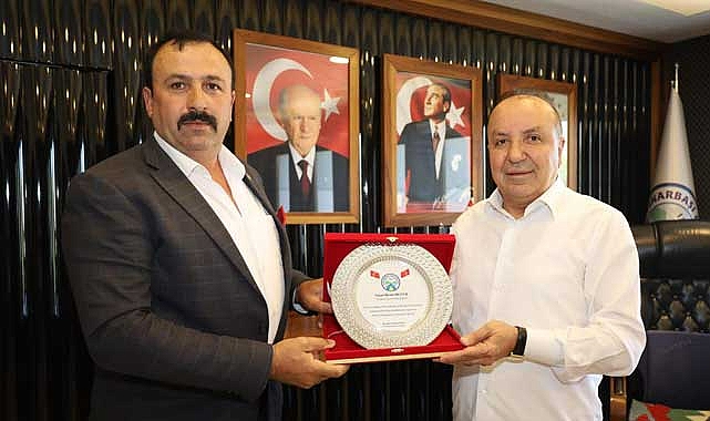 Pınarbaşı Belediye Başkanı Menduh Uzunluoğlu, İlçe Ziraat Odası Başkanı Mesut Mucuk'a bölge çiftçisinin yararına yaptığı çalışmalarından ötürü teşekkür plaketi verdi.