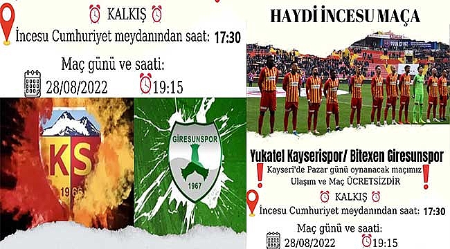 İncesu Belediye Başkanı Av. Mustafa İlmek, Kayserispor taraftarları için duyuru yaptı. Belediye Başkanı:" Otobüsler Saat:17:30'da İncesu Cumhuriyet Meydanından hareket edecektir." dedi.