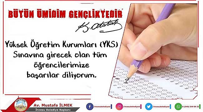 İncesu Belediye Başkanı Av. Mustafa İlmek, haftasonu yapılacak olan YKS'ye girecek öğrencilere başarılar diledi. Sosyal medya hesabından yapmış olduğu paylaşımda:"Kıymetli öğrencilerimiz, 18-19 Haziran tarihlerinde yapılacak olan Yükseköğretim Kurumları Sınavı'nda hepinize başarılar dilerim." ifadelerine yer verdi.