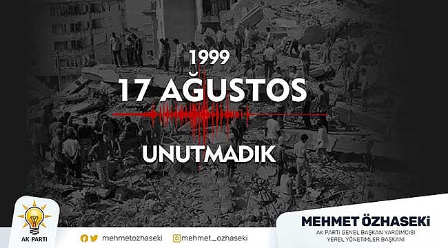 AK Parti Genel Başkan Yardımcısı ve Yerel Yönetimler Başkanı Mehmet Özhaseki, 17 Ağustos Marmara Depremi'nin 23. yılı nedeniyle başsağlığı mesajı yayımladı.