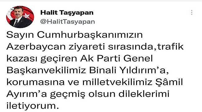 Başkan Halit Taşyapan, sosyal medya hesabından yaptığı paylaşımda, “Sayın Cumhurbaşkanımızın Azerbaycan ziyareti sırasında, trafik kazası geçiren Ak Parti Genel Başkanvekilimiz Binali Yıldırım’a, korumasına ve milletvekilimiz "Şâmil Ayırım’a geçmiş olsun dileklerimi iletiyorum” ifadelerini kullandı.