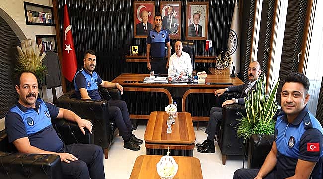 Zabıta teşkilatının 196. kuruluş yıl dönümü dolayısıyla Pınarbaşı Belediyesi Zabıta Müdürlüğü çalışanları, Belediye Başkanı Menduh Uzunluoğlu’nu makamında ziyaret etti.