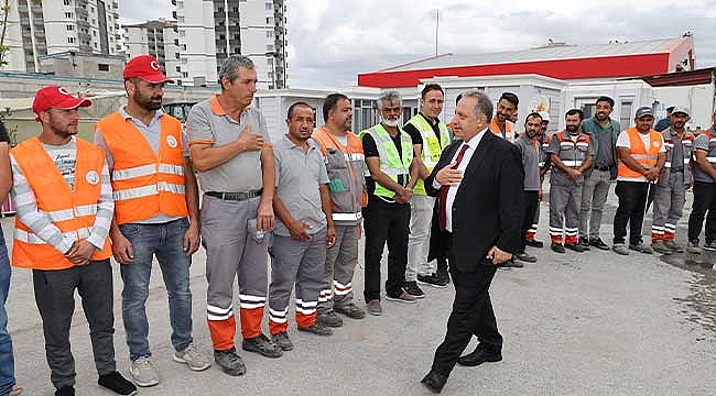Başkan Yalçın güne ilk olarak Teknik Birimler Şantiyesinde temizlik, park bahçe, makine ikmal ve ulaşım hizmetlerinde görevli personelle bir araya gelerek başladı.