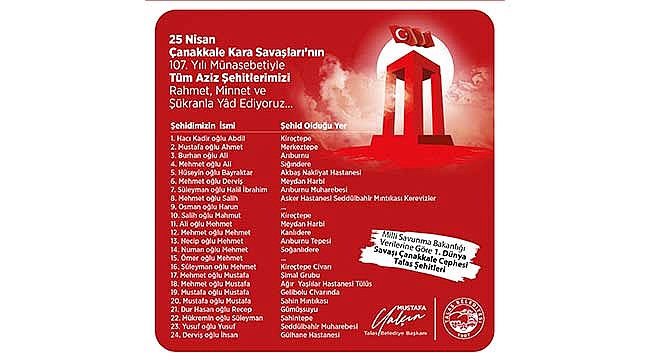 Sosyal medya hesabından yaptığı paylaşımda Talaslı şehitlerin isimlerini tek tek sıralayan Başkan Yalçın, “25 Nisan Çanakkale Kara Savaşlarının 107. Yıldönümü münasebetiyle tüm aziz şehitlerimizi rahmet, minnet ve şükranla yad ediyoruz" ifadelerini kullandı.