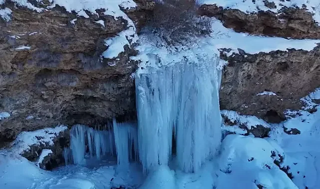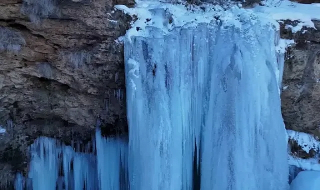 Bayburt'ta soğuk hava nedeniyle Sırakayalar Şelalesi donarken, boyları 10 metreyi aşan buz sarkıtları oluştu.