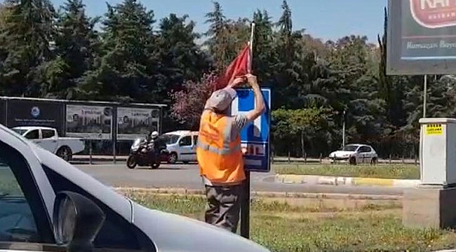 Antalya'da belediyenin temizlik görevlisi, yerde bulduğu Türk bayrağını temizleyip, bilgi tabelasına tutturduğu sopaya astı. Bu anlar, yoldaki sürücü tarafından cep telefonu kamerasıyla kaydedildi.