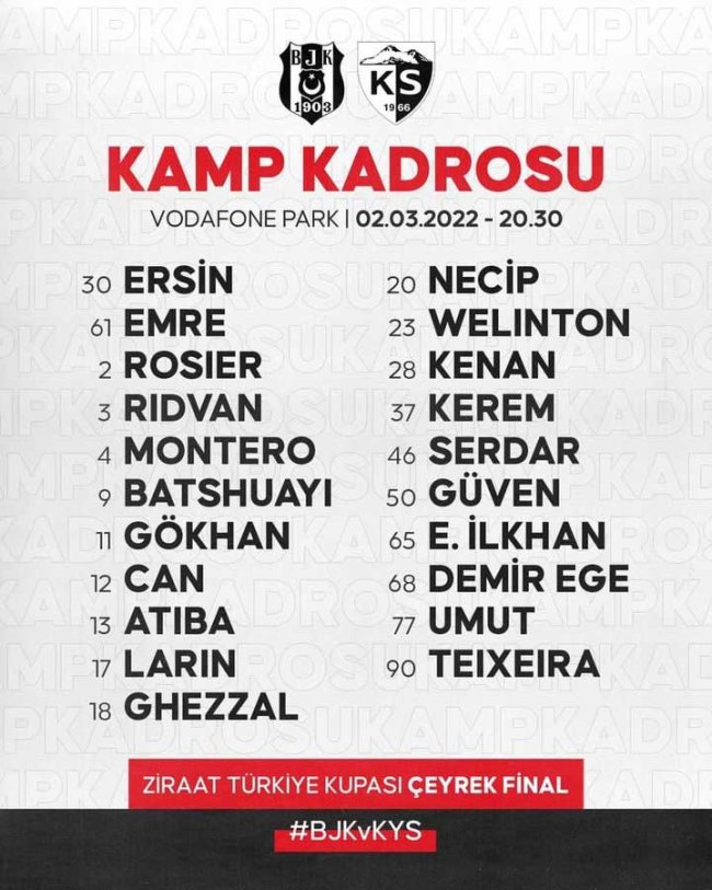 Spor Yayınlanma: 01 Mart 2022 - 20:24 Güncelleme: 01 Mart 2022 - 20:26 Beşiktaş'ın Kayserispor maçı kamp kadrosu belli oldu! Ziraat Türkiye Kupası çeyrek final maçında Beşiktaş sahasında Kayserispor'u konuk edecek. Zorlu mücadele öncesinde siyah-beyazlıların kamp kadrosu belli oldu. Spor 01 Mart 2022 - 20:24 Güncelleme: 01 Mart 2022 - 20:26 Yorumlar TAKİP ET A Büyüt A Küçült Yorumlar İŞTE KAMP KADROSU: YORUMLAR adlı kullanıcıya cevap x Gönder İlginizi Çekebilir Galatasaray'da tarihi sonuç! TFF'den açıklama! Mateusz Lis, Lech Poznan'a mı transfer oluyor! Asensio Rizespor maçında yer almayacak! Son Haberler Erzincan'da son dakika deprem alarmı! Doç. Dr. Bilgin: "Okullar da danışman ve rehberlerin sayısı arttırılmalı" Oğlu akıma kapıldı; babadan dikat çeken iddia! Cumhurbaşkanı Yardımcısı Yılmaz'dan Avrupa açıklaması! İran-ABD savaş'ında tarihi karar! Son Dakika: EPGİS duyurdu! LPG oto gaza ne kadar zam geldi Son Dakika: EPGİS duyurdu! LPG oto gaza ne kadar zam geldi